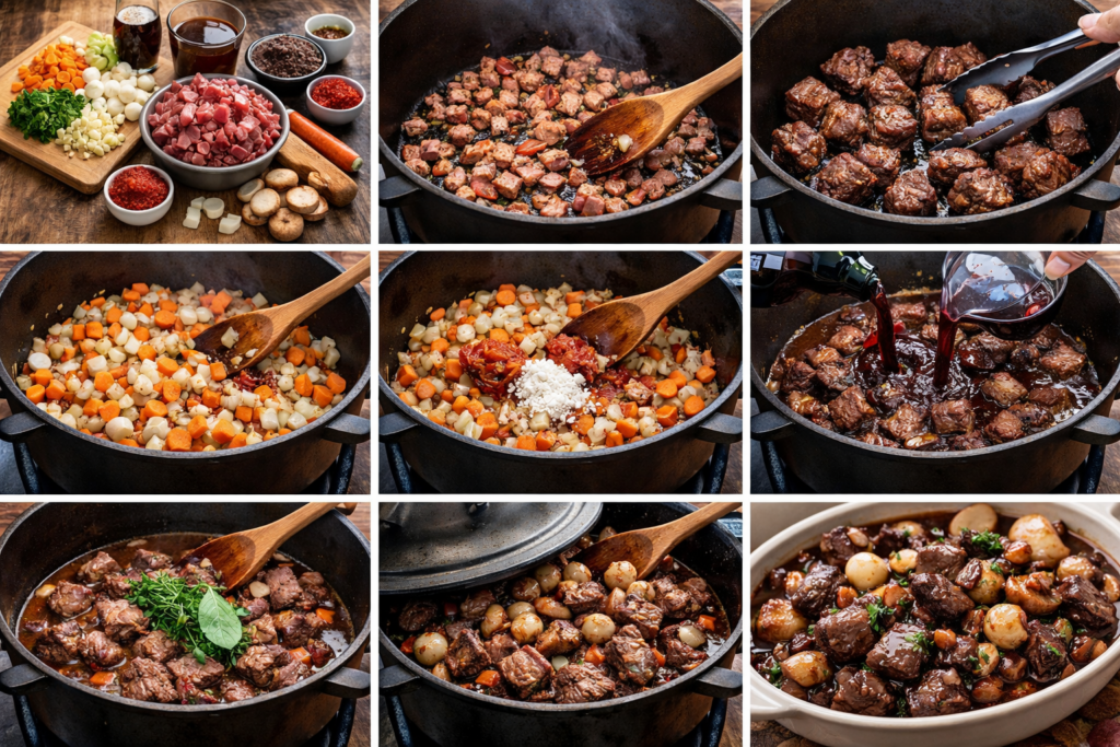 This classic French beef stew made by slowly braising tender beef in red wine with carrots, onions, mushrooms, and herbs. Rich, comforting, and full of deep flavor, this traditional dish is perfect for a cozy family dinner or special occasion and tastes even better the next day.
