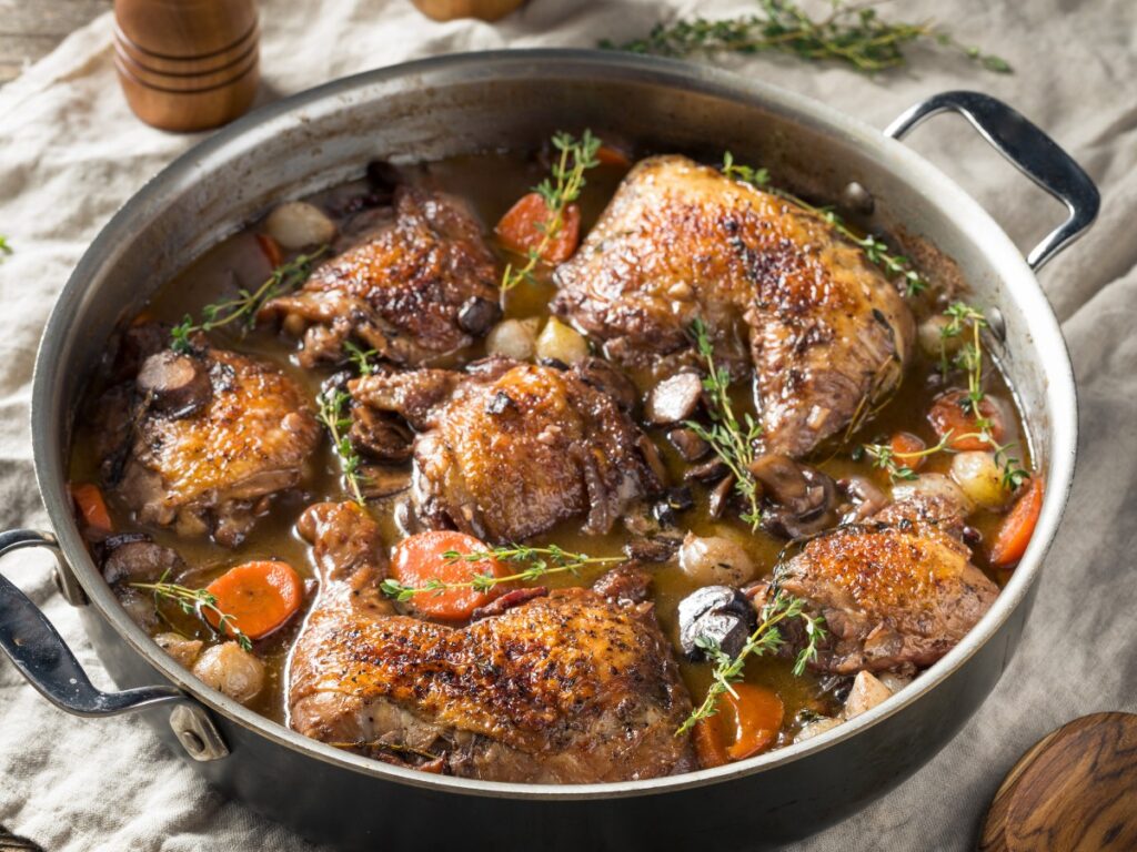 A cozy French classic where chicken is gently braised in red wine with bacon, mushrooms, and herbs until tender and deeply flavorful.